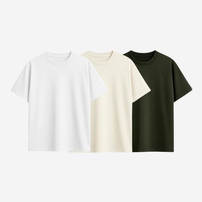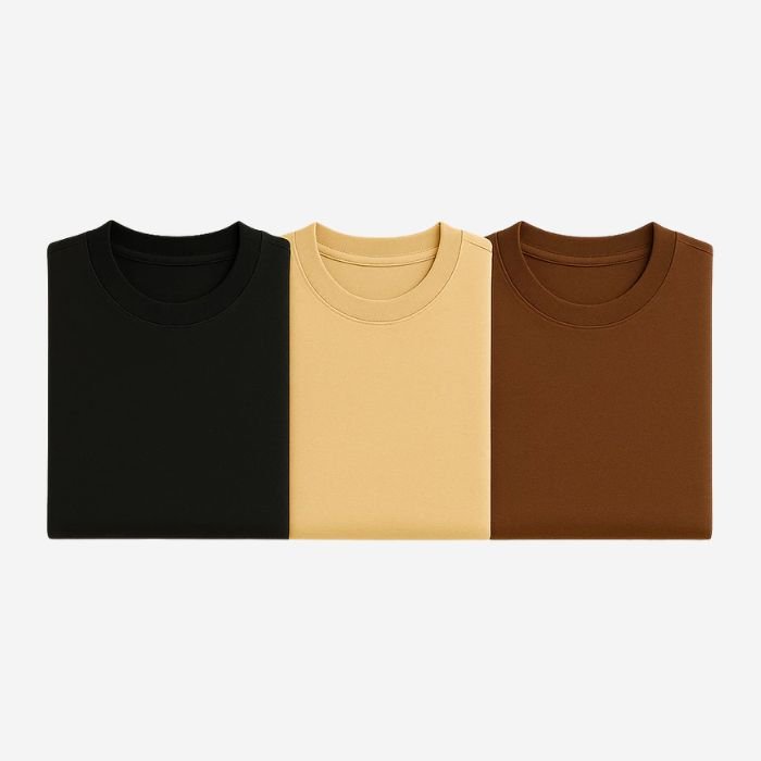 Ao escolher o kit de camisetas básicas premium sortidas, o cliente receberá peças em cores variadas, enviadas de forma aleatória conforme disponibilidade em estoque.